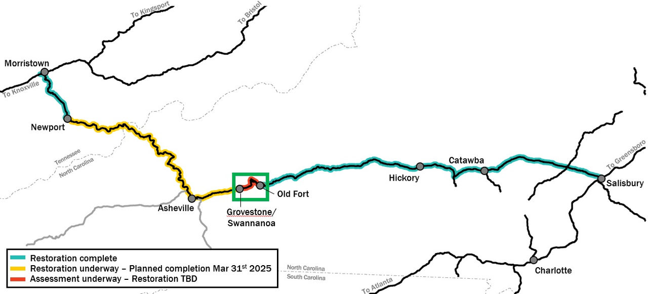 The section of track running east from Newport, Tenn. through Asheville, to Grovestone, N.C. is now projected to reopen March 31, 2025. The portion of the line that runs between Grovestone and Old Fort remains under assessment.