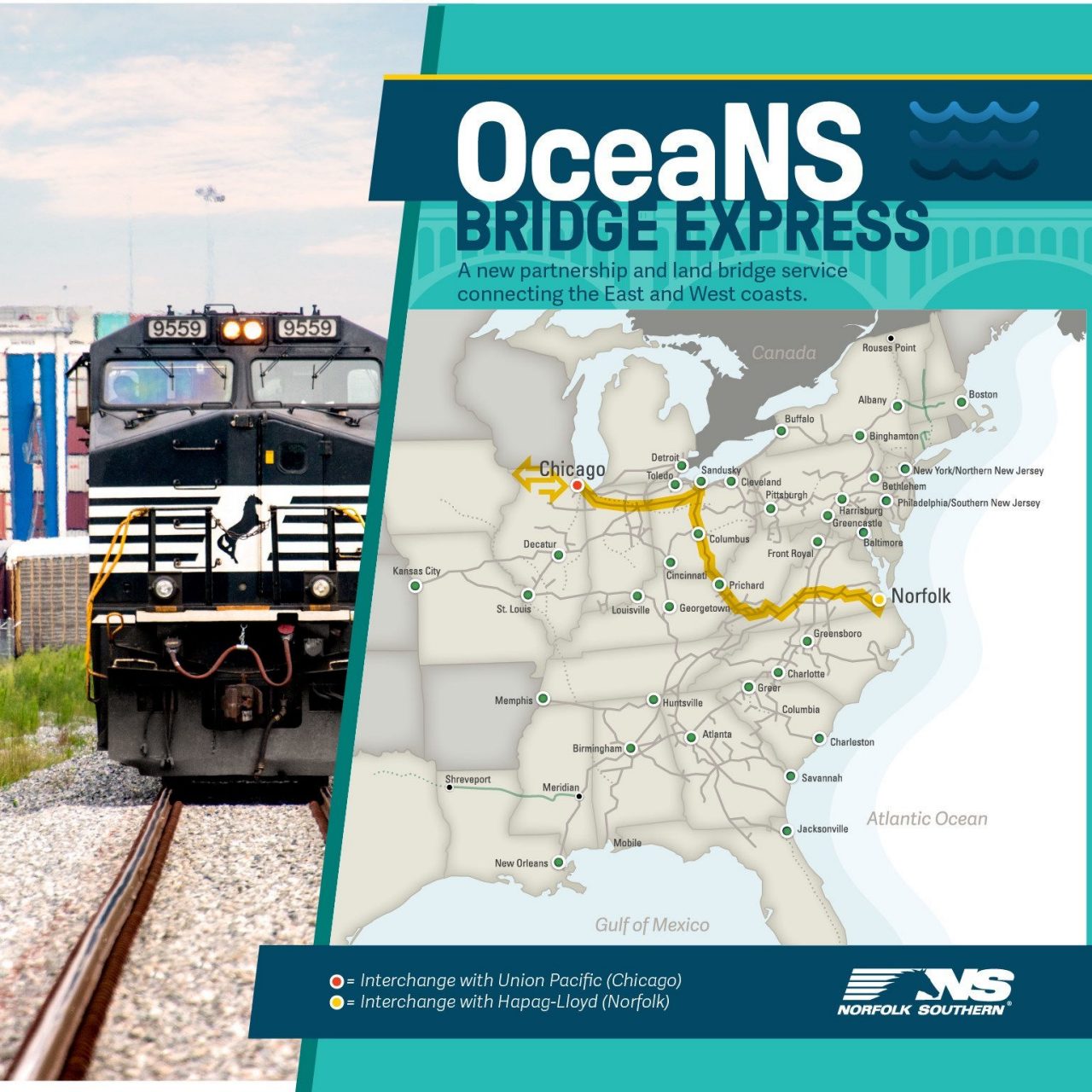ATLANTA , June 8, 2022 /PRNewswire/ -- Norfolk Southern Corporation (NYSE: NSC) today announced OceaNS Bridge Express, a new partnership with Hapag-Lloyd (FWB: HLAG), Union Pacific Railroad (NYSE: UNP), and the Port of Virginia to provide expedited service from the East Coast to the Western United States, giving shippers a new option to reach West Coast markets.