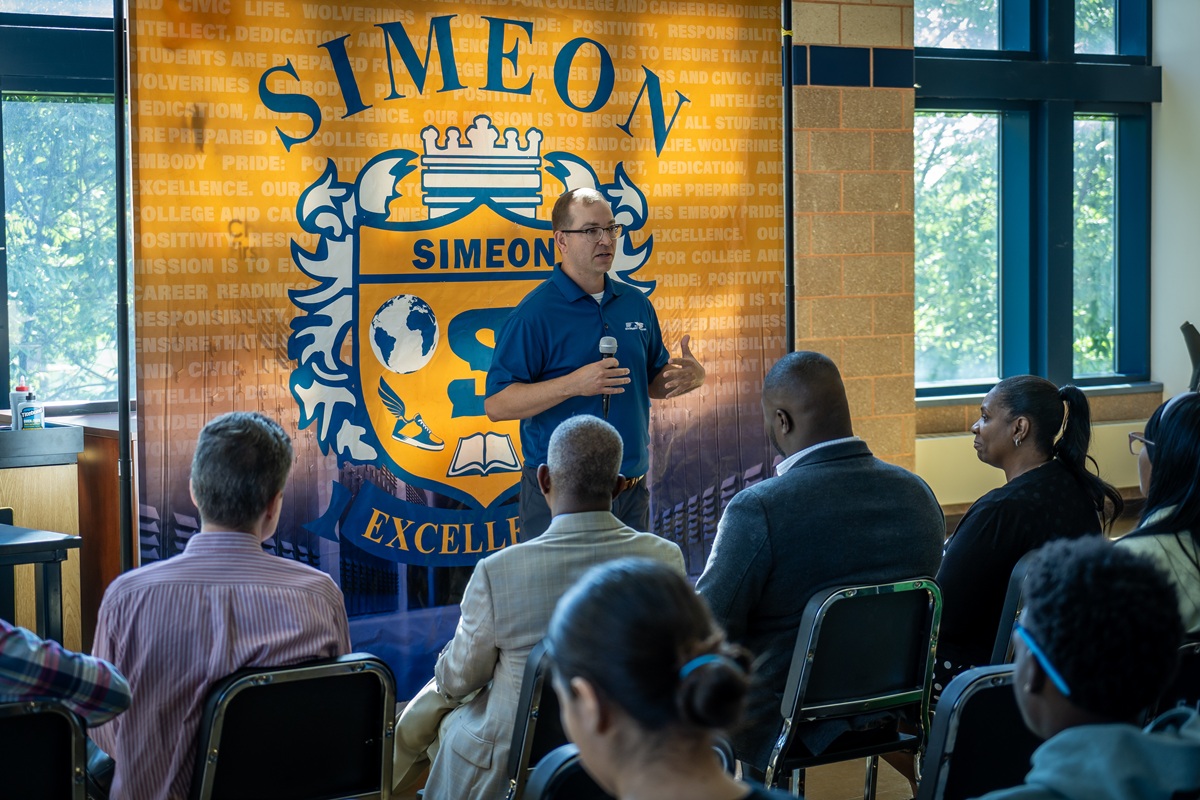 NS Regional Vice President Herbert Smith addresses students, faculty, and local officials at Simeon Career Academy, reinforcing NS support via the CREATE program.
